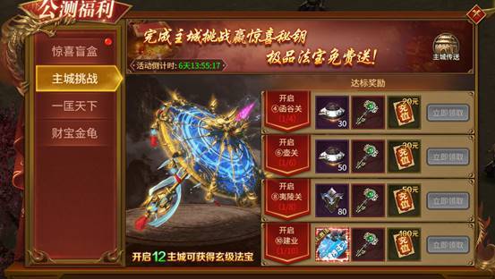 活动期间玩家开启主城地图后即可领取超多材料、充值卡奖励,更有稀有法宝,激活后可加成大量战力